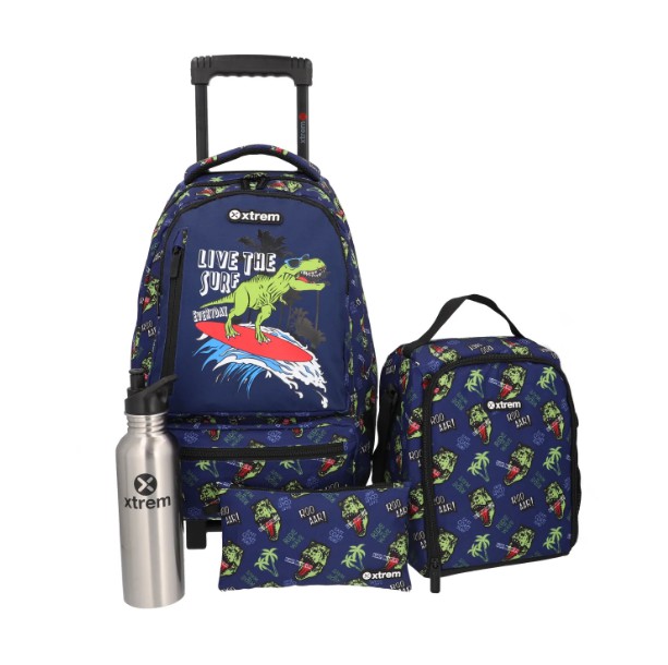 O Cross Pack consiste em uma Mochila com um carrinho de alumínio com duas posições para ajustar a altura. Tem 30 litros de capacidade e rodinhas de alto tráfego que tornam a mochila mais resistente. No painel frontal, a mochila tem um zíper vertical e um compartimento organizador com zíperes kissing lock para aumentar a segurança. Na parte interna, compartimento de pasta de tamanho ofício. Uma lancheira de 7 litros acompanha a mochila, com interior em PEVA, um material livre de contaminantes que preserva a temperatura e um estojo que combina com a mochila e a lancheira. Finalmente, adicionamos uma garrafa de água de alumínio.