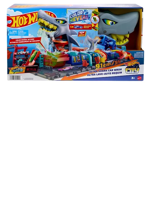 Conforme apresentado na série da Netflix, Lets Race, o Hot Wheels City Car Wash foi tomado por um enorme tubarão que quer mergulhar em ação de mudança de cor! As crianças dirigem o veículo Color Reveal incluído pela rampa até a boca do tubarão, depois pressionam a cabeça do tubarão para mudar a cor da água e revelar a decoração do carro. Encoste o tubarão e observe o carro correr por dentro enquanto o excesso de água escoa. Toque na cauda do tubarão para lançar os carros do estacionamento ou no tanque de água gelada para uma surpresa de mudança de cor. Mude as cores do carro passando pela lavagem novamente. A reprodução detalhada da pista na base aprimora a narrativa com portões móveis e um rolo de espuma que lembra um lava-rápido da vida real. O conjunto dobra-se ao meio para facilitar o armazenamento e inclui uma alça para ajudar a carregá-lo e drenar o excesso de água. Um veículo Hot Wheels Color Reveal está incluído. Cores e decorações podem variar.